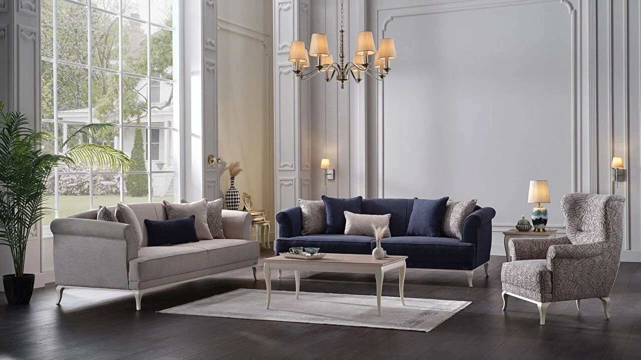Bellona Andera Serisi, 2026 yılında da hem gösterişten ödün vermeyen hem de modernlik arayan çiftlerin gözdesi. Lacivert ve grinin asaletini, yüksek beyaz ayaklar ve gold detaylarla birleştiren bu paket, yaşam alanlarınıza derinlik katıyor.