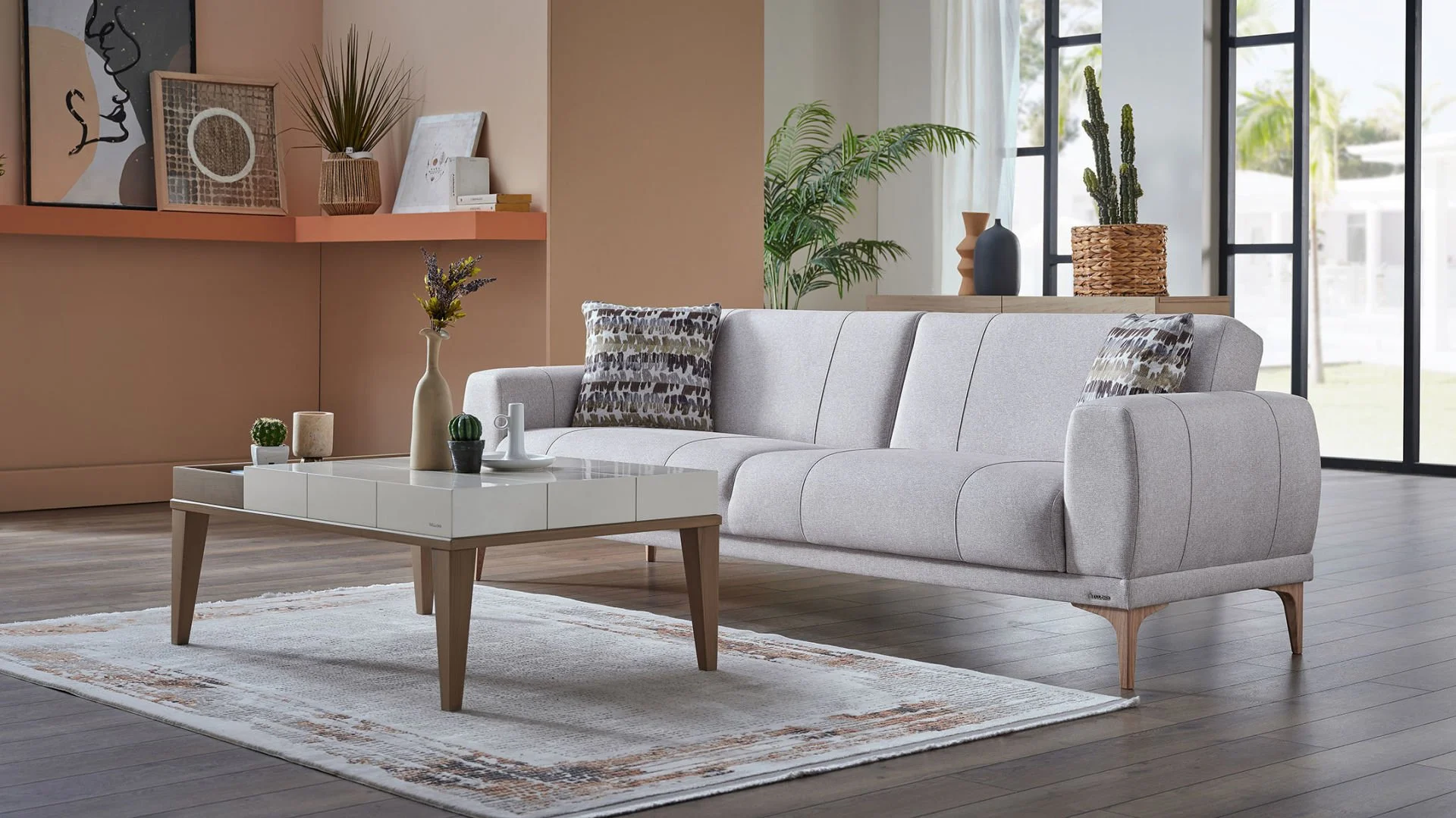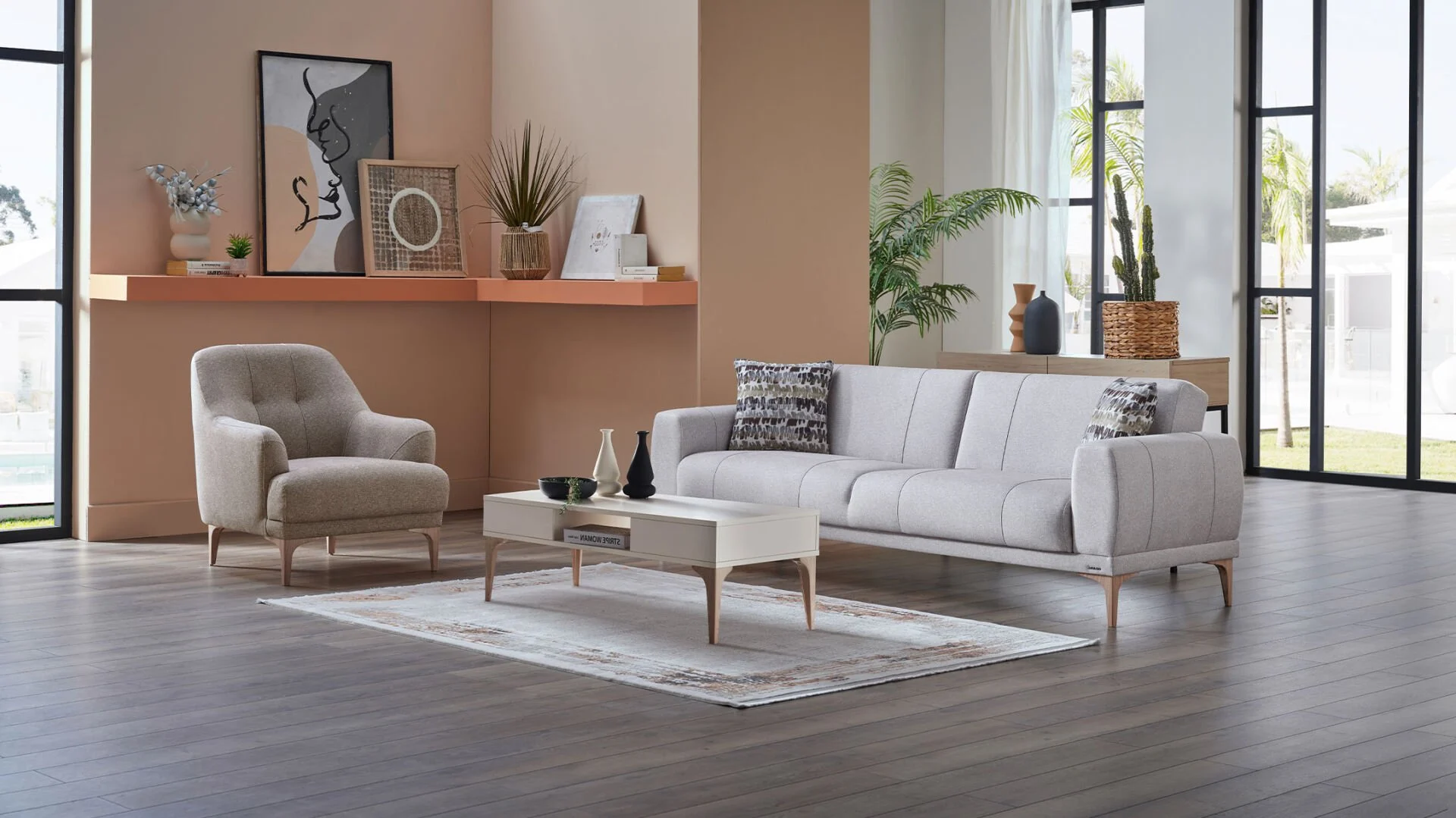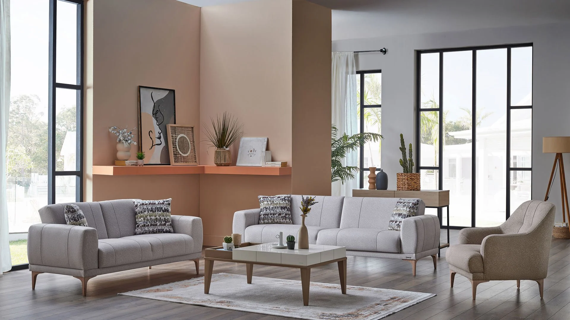 Porto’nun ana rengi olan Menna Krem, salonunuza ferahlık ve genişlik algısı katar. Berjerlerde ve kırlentlerde kullanılan Kahve tonları ise bu ferahlığı sıcak bir yuva hissiyle dengeler. Bu renk paleti, 2026’nın “Doğala Dönüş” akımının en güzel örneğidir.