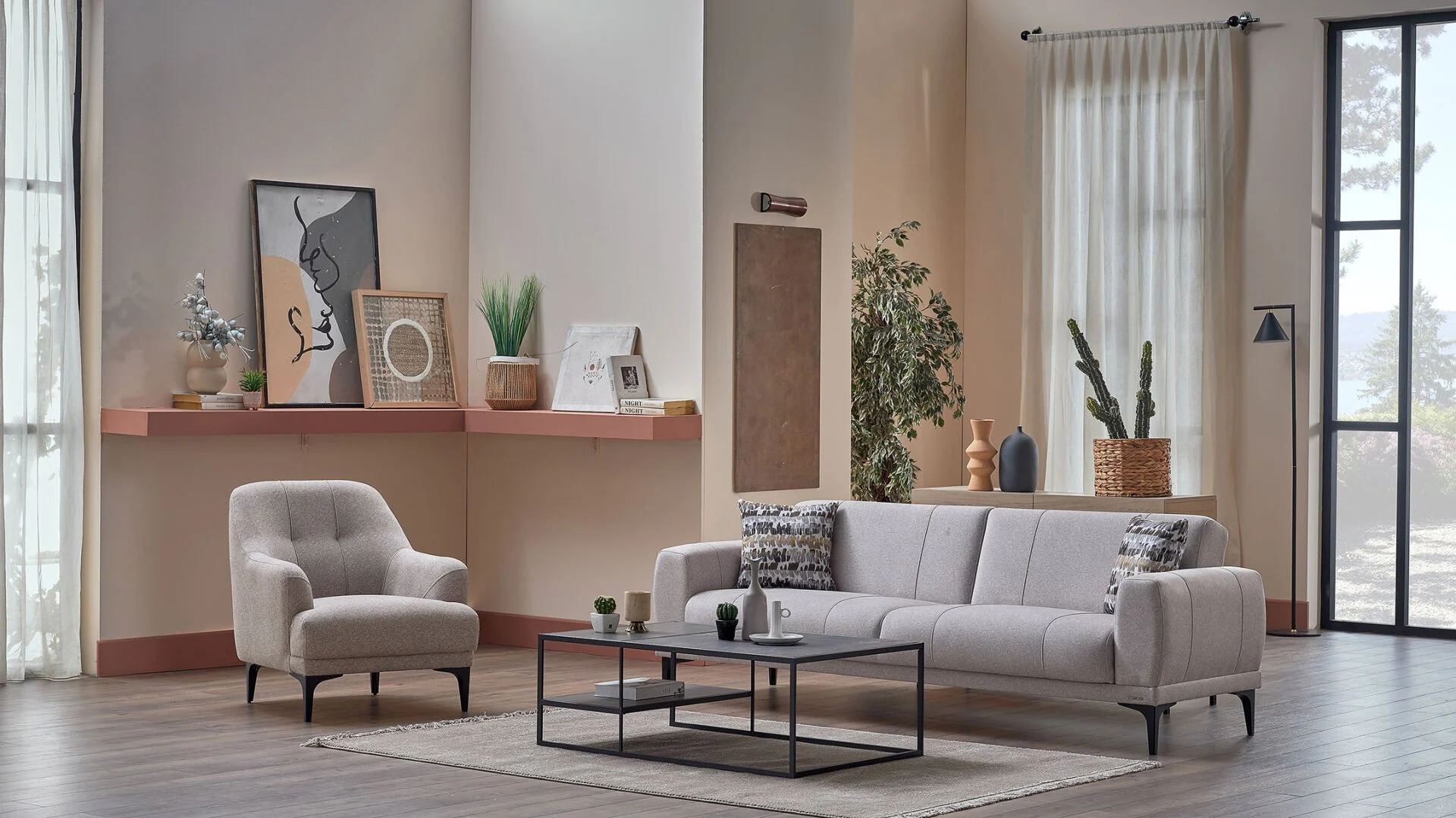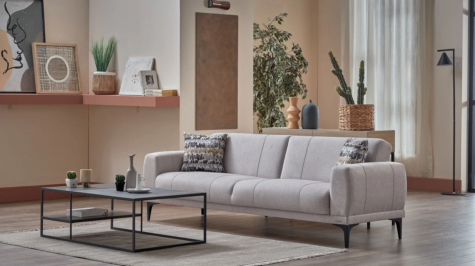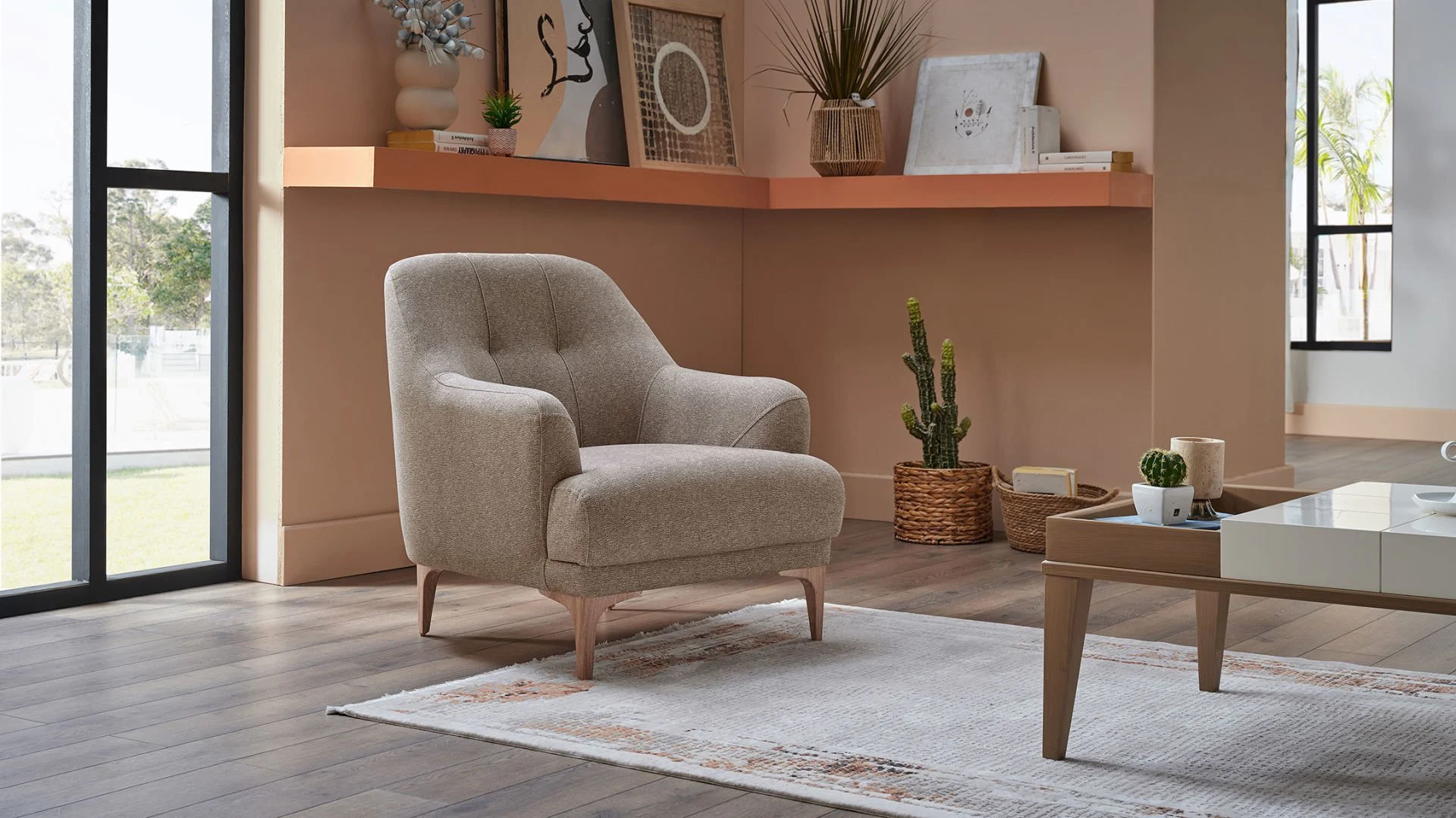 Porto’nun ana rengi olan Menna Krem, salonunuza ferahlık ve genişlik algısı katar. Berjerlerde ve kırlentlerde kullanılan Kahve tonları ise bu ferahlığı sıcak bir yuva hissiyle dengeler. Bu renk paleti, 2026’nın “Doğala Dönüş” akımının en güzel örneğidir.