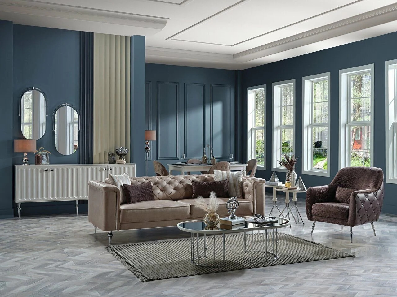 Sandalyelerin döşeme minderleri beş yıldızlı konfor sunuyor. Konsol ve vitrin, yemek takımlarınızı ve değerli eşyalarınızı sergilemenize olanak tanıyor. Konsol aynası ise yemek odanızın ferahlığını ve ışıltısını artırıyor.