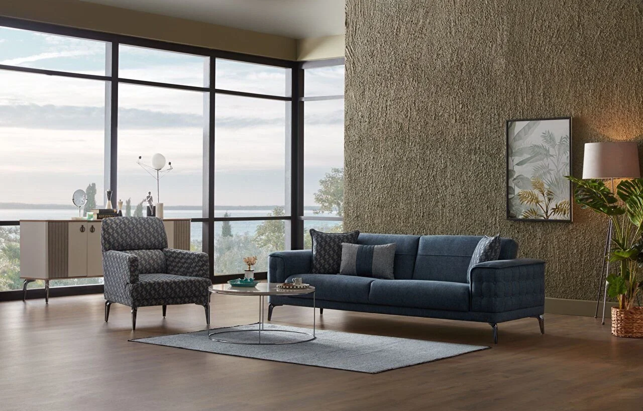 Koltuk ayaklarında yüksek olması ve koltuğun üzerinde kullanılan mavi ve beyaz detaylar, salonunuzu oldukça şık ve zarif bir görünüm oluşturuyor.