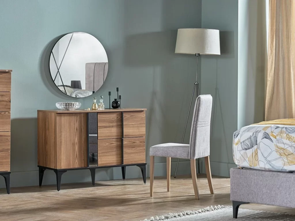 Zarif ve ihtişamlı görünümü ile gönülleri fetheden makyaj masası ve yuvarlak aynası, birbiriyle uyumlu bir şekilde tasarlanmış. Kapaklı bölmesi ve çekmece ile makyaj malzemeleri ve diğer ürünler için saklama alanları sunuyor.